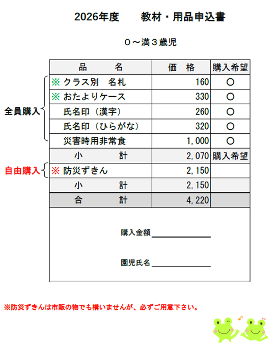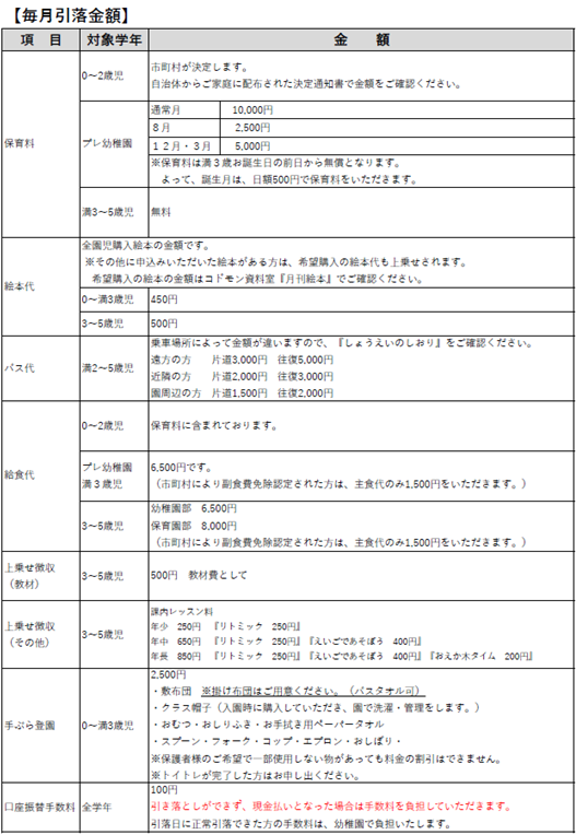 ※その他、行事(遠足・お泊り会等)にかかる金額は、その都度お知らせいたします。
