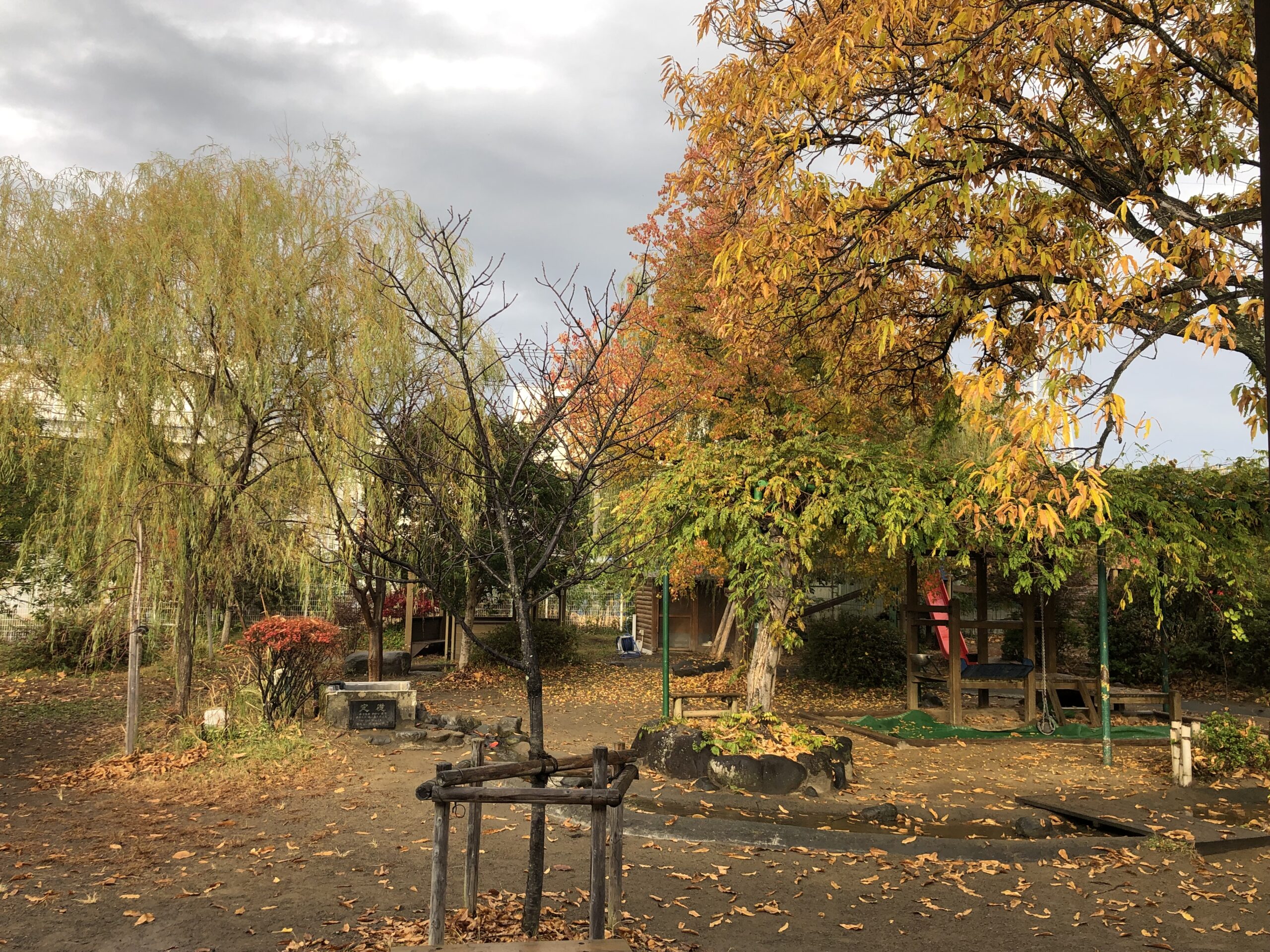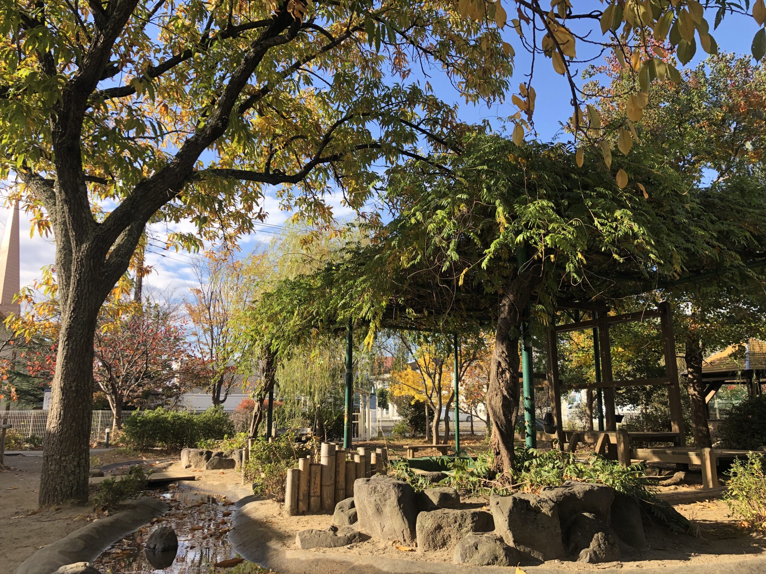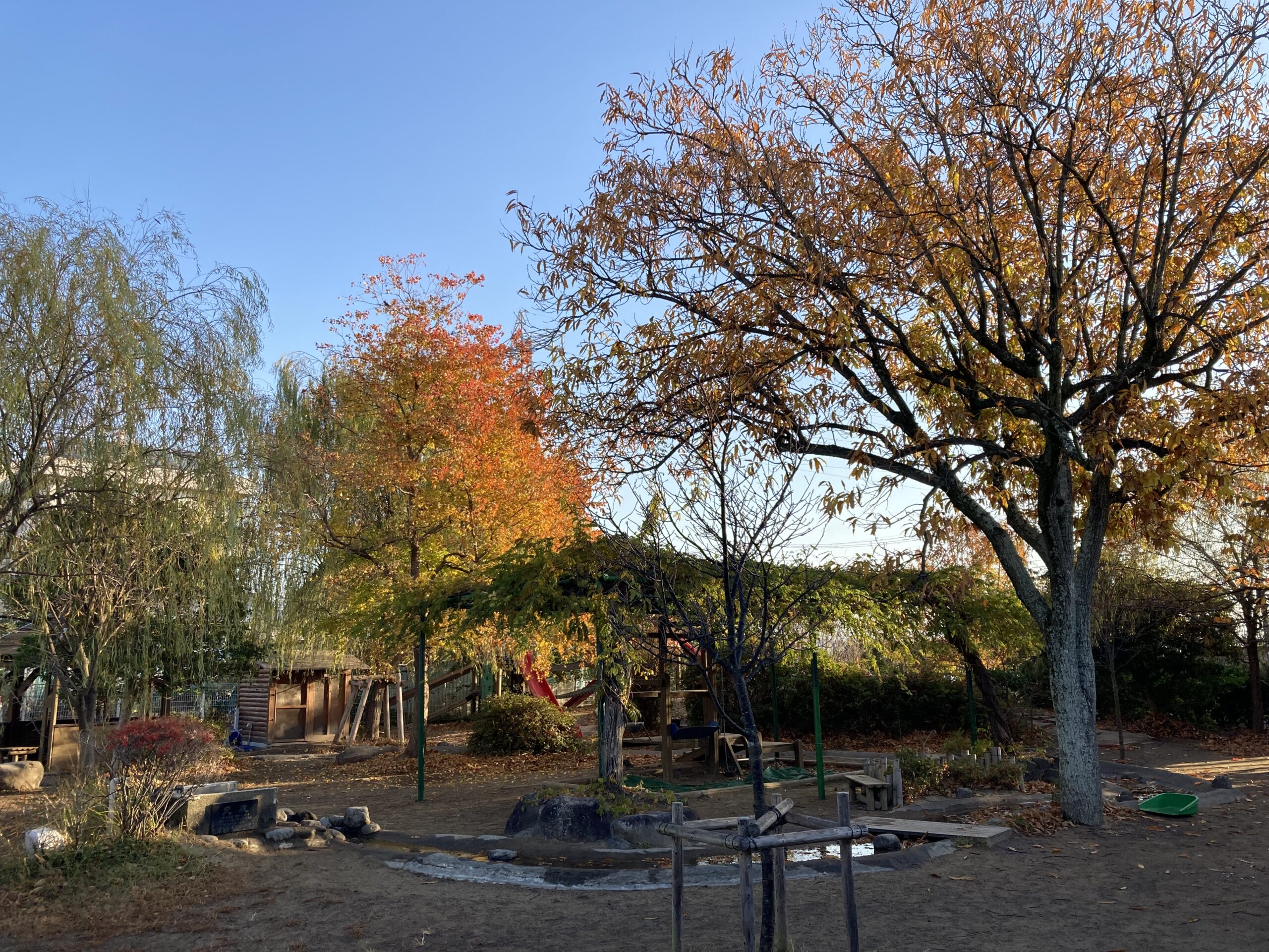 運動場ではなく、自然・生物との共生をテーマにしたメイン園庭『わんぱく広場』です。開放的な広場には自然と子どもたちが集まり、自ら遊びを創り出す空間となっています。